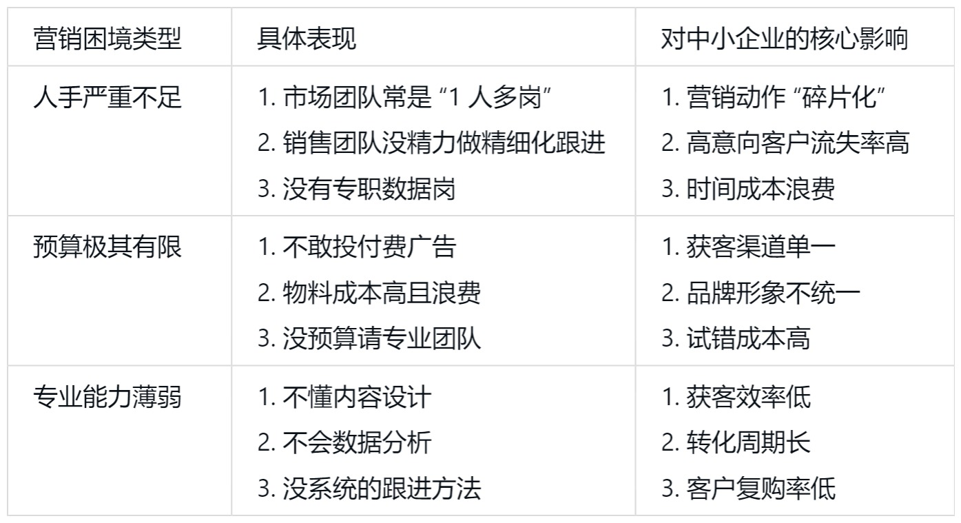 一、中小企业营销的核心困境:人手少、预算低、专业弱